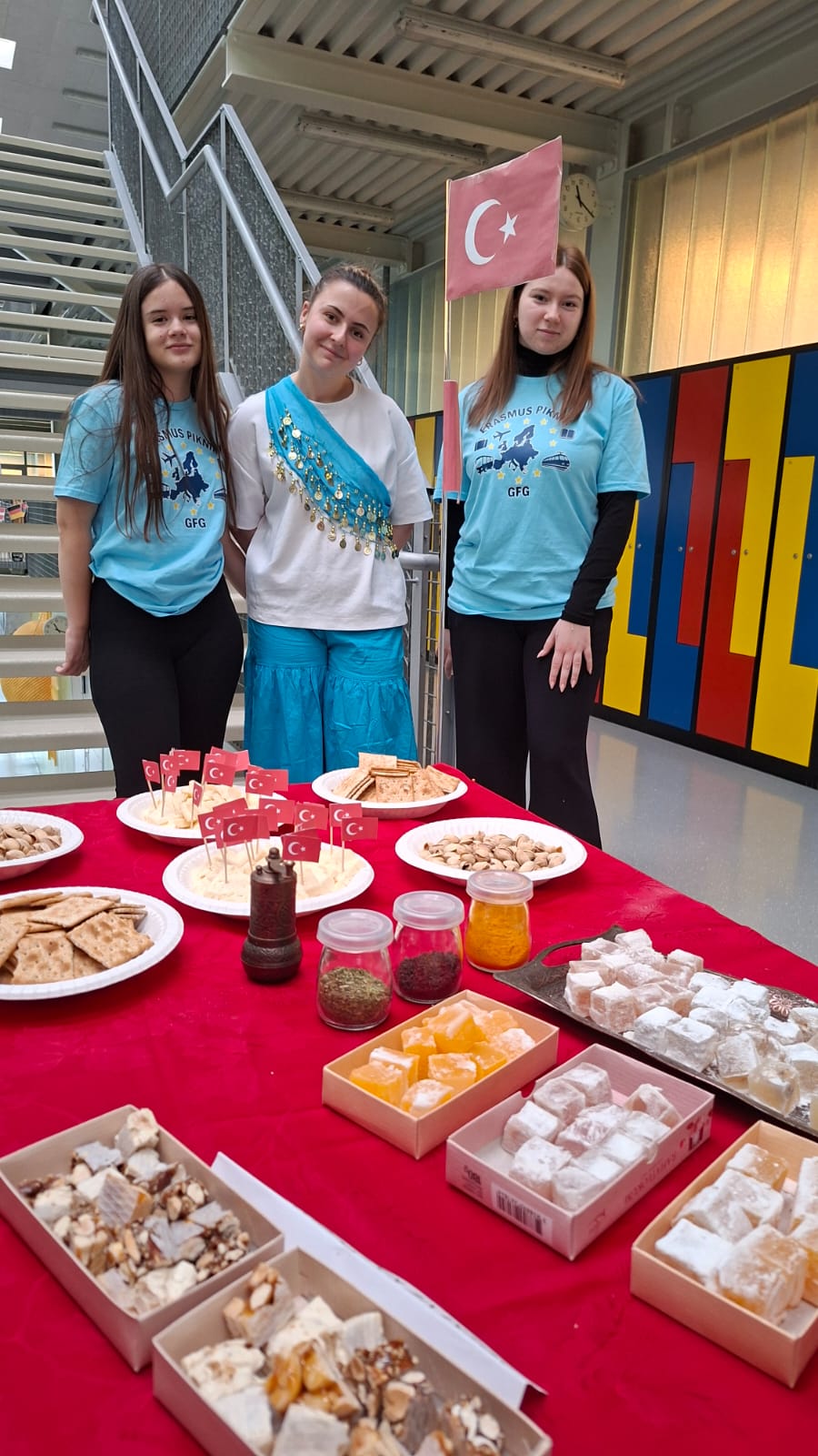 Miris kave i čaja širio se hodnicima s turskog stola. Profesorice Katarina Horvat i Darija Kivač pripremile su predstavljanje Turske. Izloženi su bili tipični turski predmeti (džezva, bakreni mlinci, posudice), turski začini, a mogao se probati i rahat lokum raznih vrsta, turon od badema i karamele sa sjemenkama sezama, slani sir, pistacije, a sve to uz zvuke turske glazbe. Svoje znanje o Turskoj mogli ste provjeriti u kvizu, a više o kulturnoj baštini ispričala je učenica Martina Forjan koja je nosila dijelove turske nošnje.