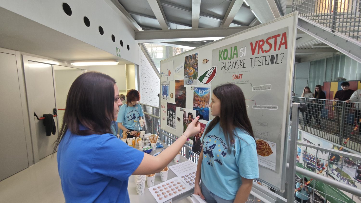 Radionicu „Next stop: Italia!“ i predstavljanje Italije pripremile su profesorice Ivana Pavela, Mišela Lokotar i Petra Porić. Mnogima je bila zabavna radionica s tjesteninom. Interaktivna radionica osmišljena je kao gamificirani test ličnosti (kviz) postavljen u javni prostor škole. Koristeći vizualni dijagram toka (flowchart), učenici odgovaraju na niz pitanja o vlastitim preferencijama, životnom stilu i navikama. Ishod procesa je identifikacija s jednim od triju tipa talijanske tjestenine (Spaghetti, Farfalle, Penne all’Arrabbiata), koji metaforički predstavljaju različite tipove osobnosti. Aktivnost završava nagradom u obliku naljepnice koja služi kao oznaka identiteta i poticaj za daljnju socijalnu interakciju. Mnogi učenici osjećaju strah od sudjelovanja u Erasmus+ projektima jer misle da nisu dovoljno dobri u jezicima ili akademskom uspjehu. Ova je radionica nisko-rizična ulazna točka i šalje snažnu poruku: „Erasmus+ je za svakoga, baš kao i pašta!“. No, osim ove „ozbiljne“ teme, mogli ste se i fotkati u kutku s vespom, talijanskom maramom i sunčanim naočalama (kao prave Talijanke) i uživati u tradicionalnim talijanskim kanconama, kao i u modernoj glazbi talijanskih glazbenika.